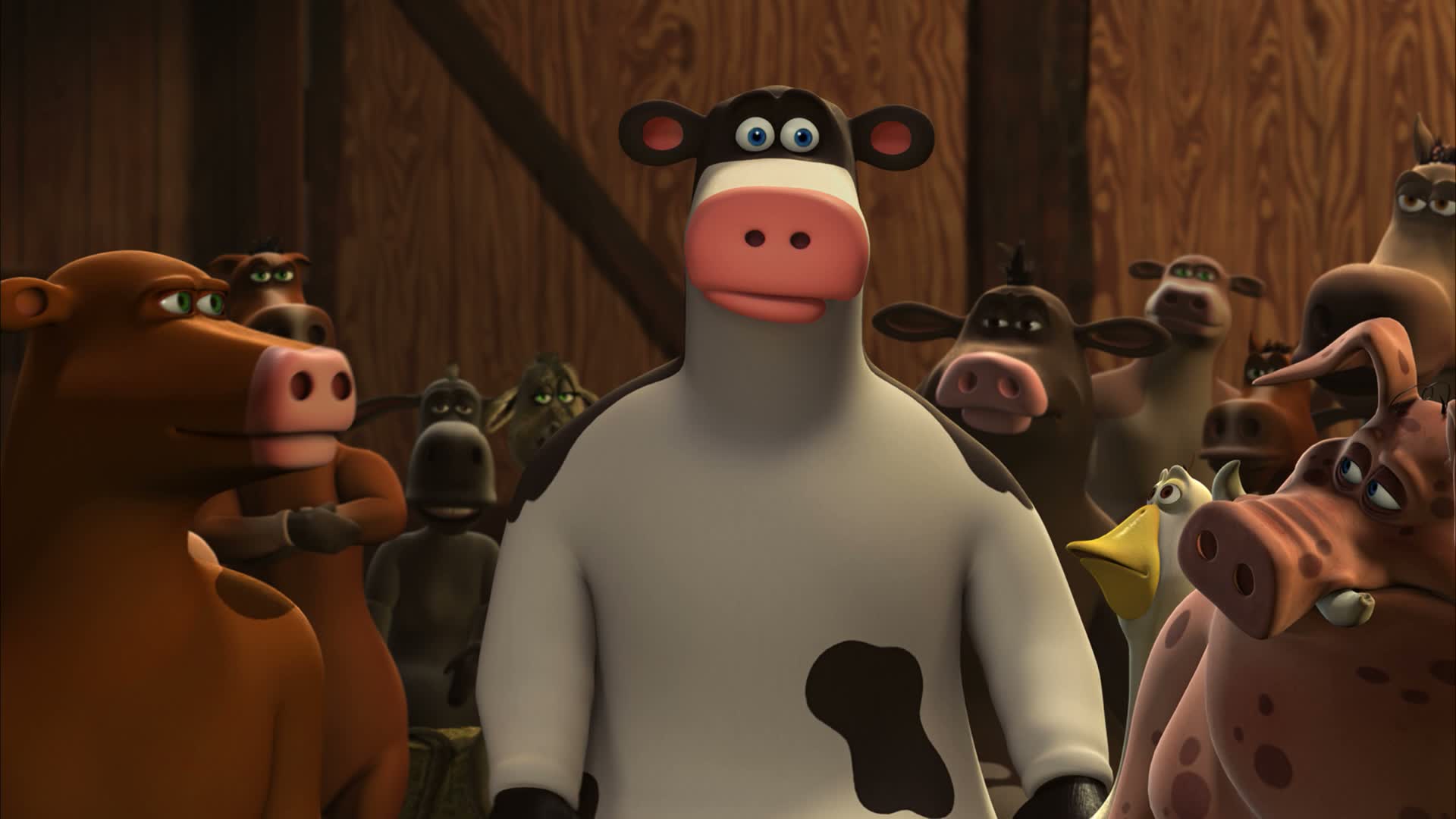 Otis is a mischievous, carefree Holstein cow who lives on a farm where, unbeknownst to humans, the animals are anthropomorphic. He prefers having fun with his best friends: Pip the mouse, Freddy the ferret, Peck the rooster, and Pig the pig - rather than following strict rules and accepting responsibility. This annoys his stern adoptive father Ben, the leader of the farm's community. One evening, Otis convinces Ben to cover his night watch so he can attend a massive party in the barn and impress Daisy, a pregnant cow who recently arrived at the farm with her best friend Bessy as a newcomer. As the animals party, Dag the coyote and his pack attempt to raid the chicken coop. Ben fends them off alone but is fatally wounded and killed. Otis must now learn the value of responsibility when he becomes the leader of his farm home's community.