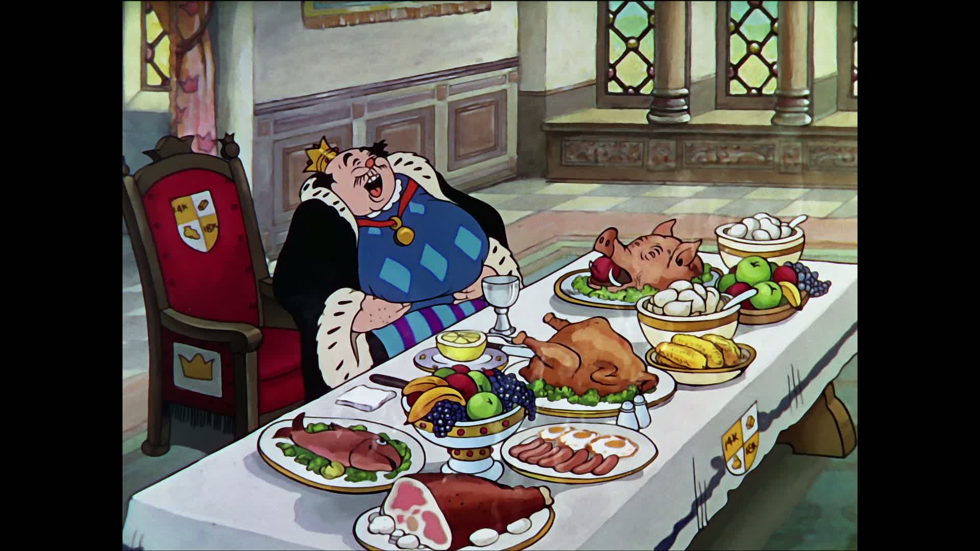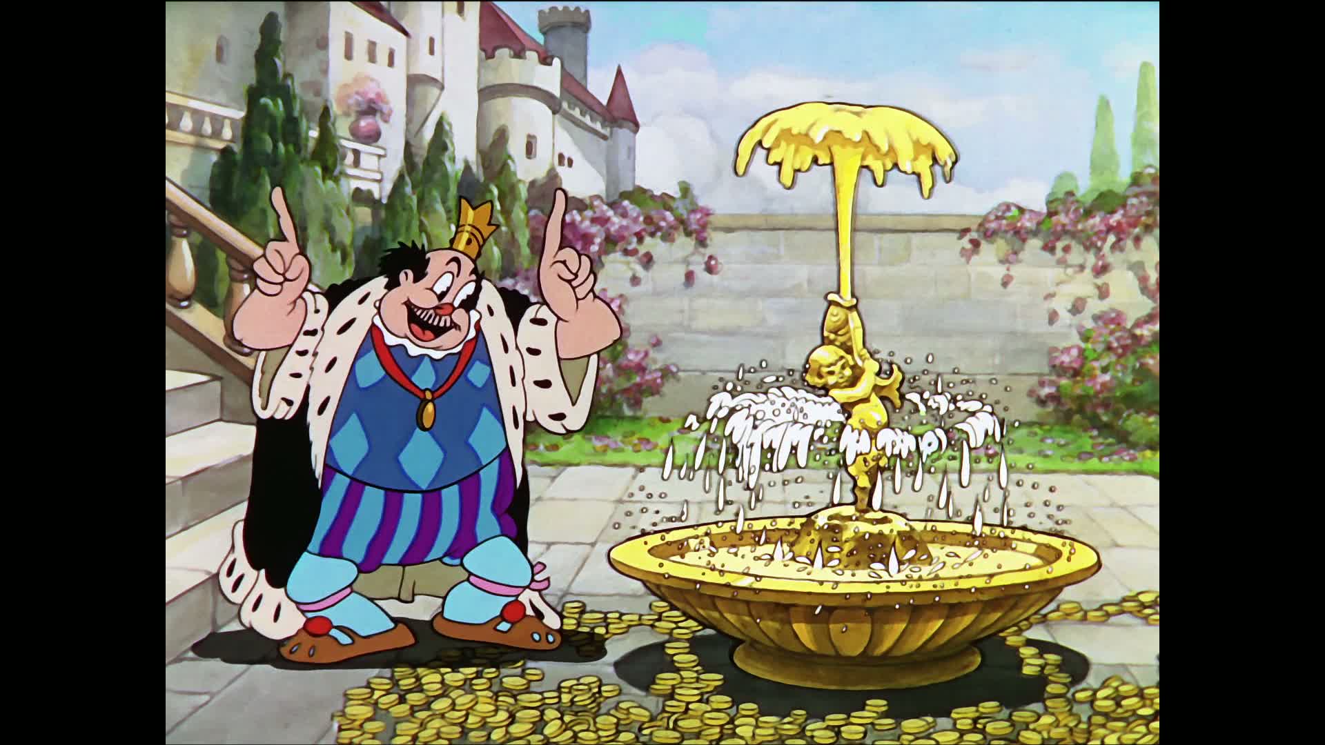 King Midas is visited by an elf; the elf turns his cat to gold, then claps his hands and it changes back. Midas begs for the golden touch, but the elf warns him it would be a curse to him. Midas insists. He dances about joyfully at first, but discovers the drawbacks when he sits down to dinner. Fearing death by starvation, he summons the elf and agrees to surrender everything he owns to have the curse lifted.