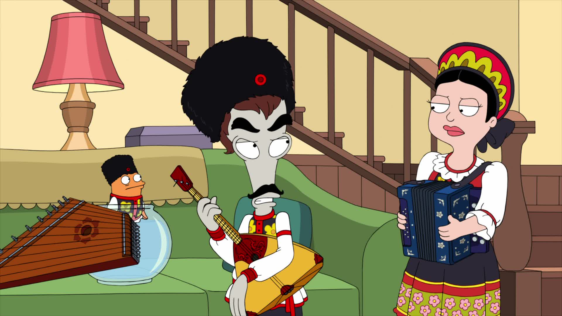 The series focuses on an eccentric motley crew that is the Smith family and their three housemates: Father, husband, and breadwinner Stan Smith; his better half housewife, Francine Smith; their college-aged daughter, Hayley Smith; and their high-school-aged son, Steve Smith. Outside of the Smith family, there are three additional main characters, including Hayley's boyfriend turned husband, Jeff Fischer; the family's man-in-a-goldfish-body pet, Klaus; and most notably the family's zany alien, Roger, who is "full of masquerades, brazenness, and shocking antics."