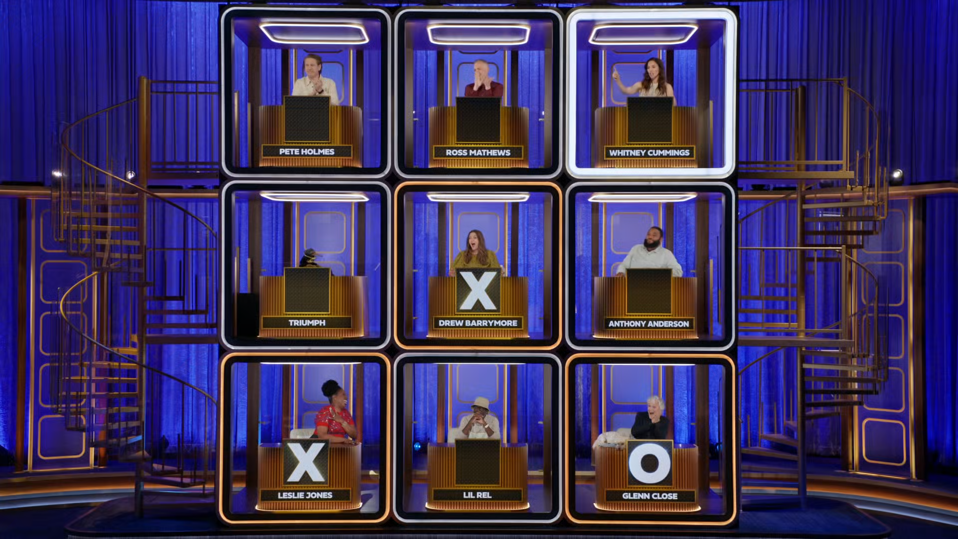 Two contestants play tic-tac-toe to win money and prizes. The "board" for the game is a vertical stack of open-faced cubes, each occupied by a celebrity seated at a desk and facing the contestants. The celebrities are asked questions and the contestants judge the legitimacy of their answers to win the game.