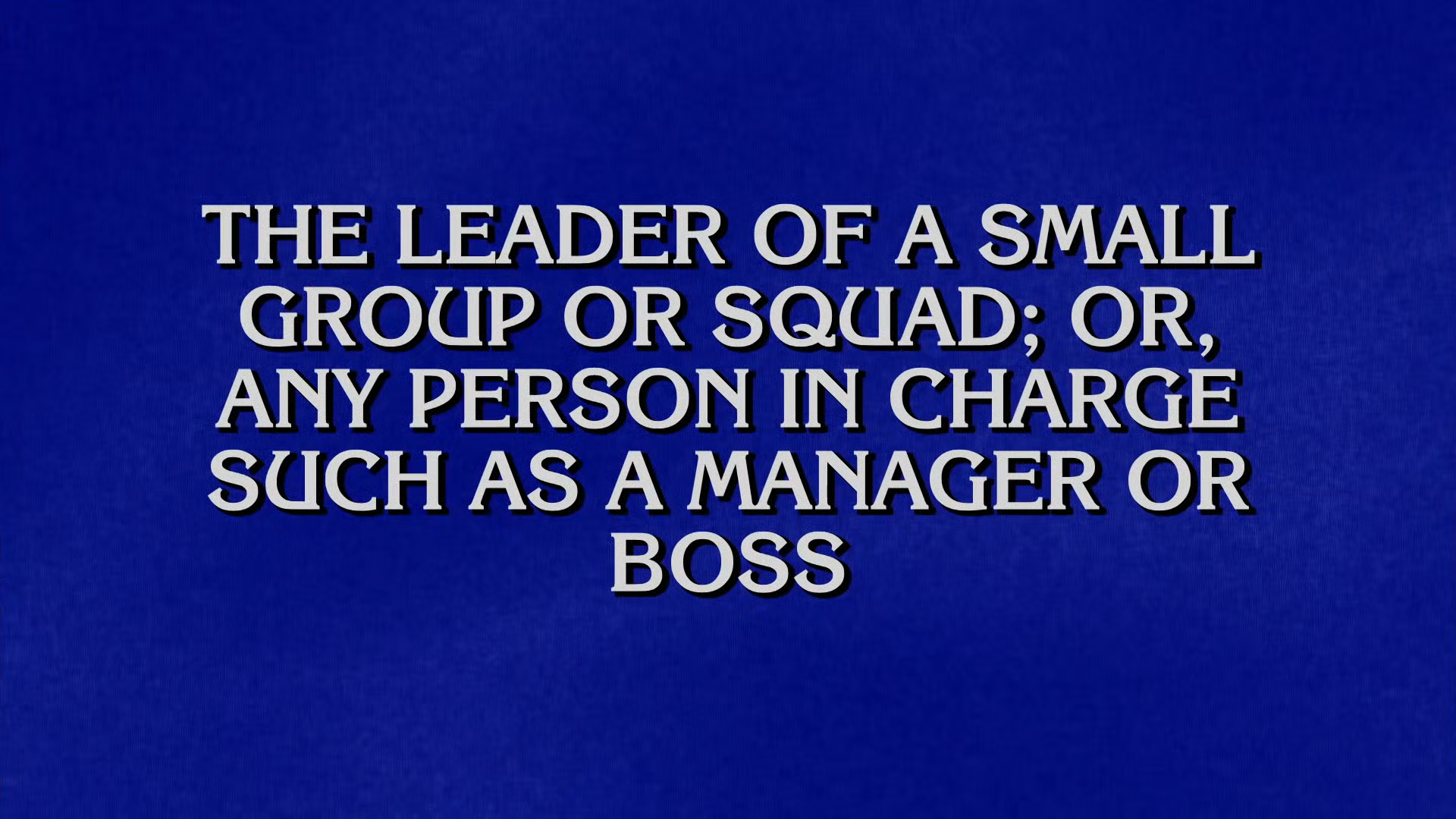 British game show based on the U.S. version of the same title. The show is a quiz competition that reverses the traditional question-and-answer format of many quiz shows. Rather than being given questions, contestants are instead given general knowledge clues in the form of answers and they must identify the person, place, thing, or idea that the clue describes, phrasing each response in the form of a question.