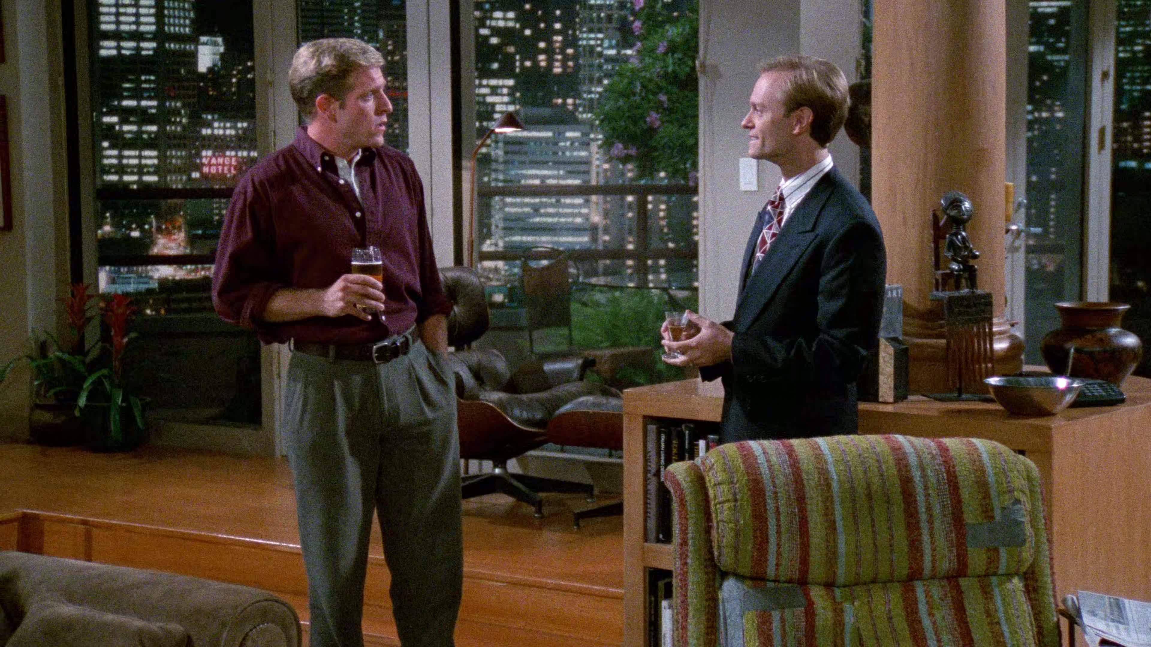 After many years spent at the “Cheers” bar, Frasier moves back home to Seattle to work as a radio psychiatrist after his policeman father gets shot in the hip on duty.