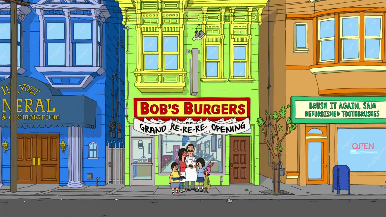 Bob's Burgers follows a third-generation restaurateur, Bob, as he runs Bob's Burgers with the help of his wife and their three kids. Bob and his quirky family have big ideas about burgers, but fall short on service and sophistication. Despite the greasy counters, lousy location and a dearth of customers, Bob and his family are determined to make Bob's Burgers "grand re-re-re-opening" a success.