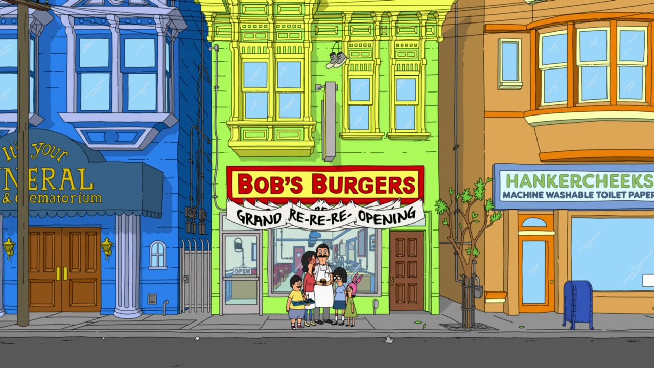 Bob's Burgers follows a third-generation restaurateur, Bob, as he runs Bob's Burgers with the help of his wife and their three kids. Bob and his quirky family have big ideas about burgers, but fall short on service and sophistication. Despite the greasy counters, lousy location and a dearth of customers, Bob and his family are determined to make Bob's Burgers "grand re-re-re-opening" a success.
