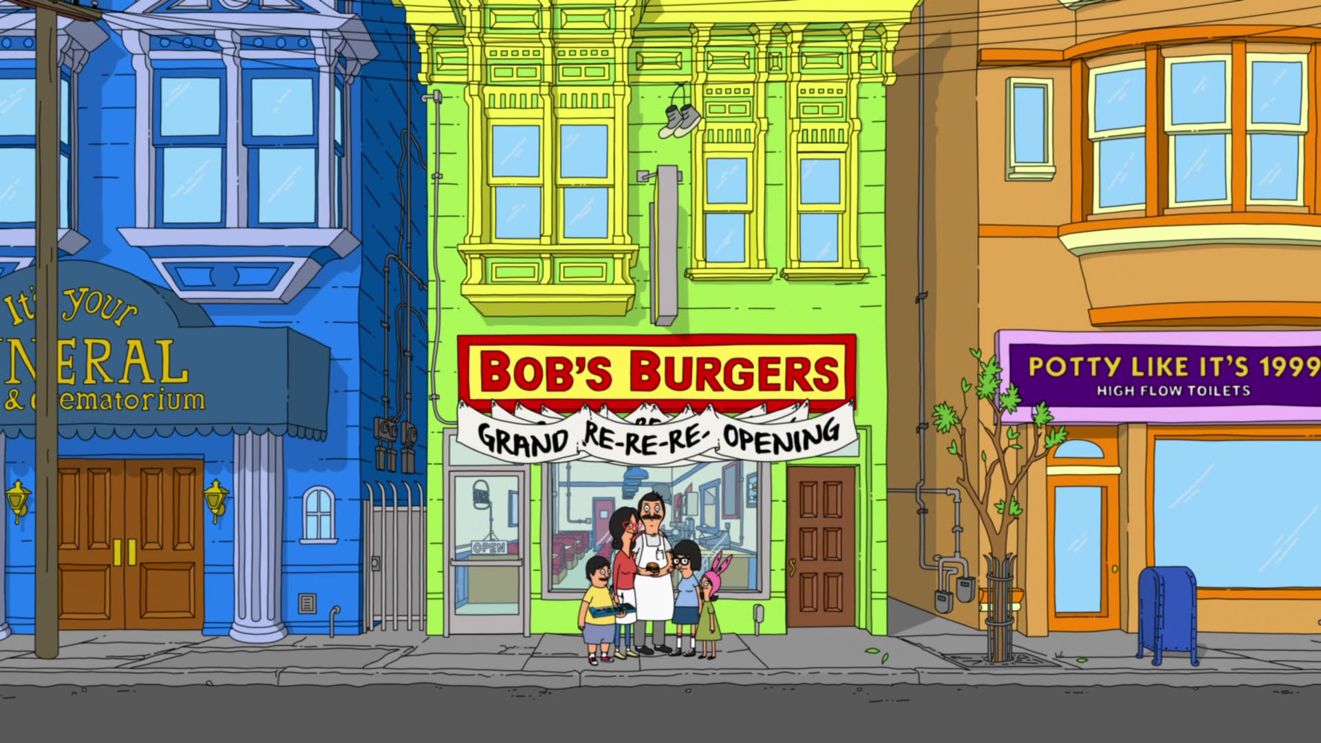 Bob's Burgers follows a third-generation restaurateur, Bob, as he runs Bob's Burgers with the help of his wife and their three kids. Bob and his quirky family have big ideas about burgers, but fall short on service and sophistication. Despite the greasy counters, lousy location and a dearth of customers, Bob and his family are determined to make Bob's Burgers "grand re-re-re-opening" a success.