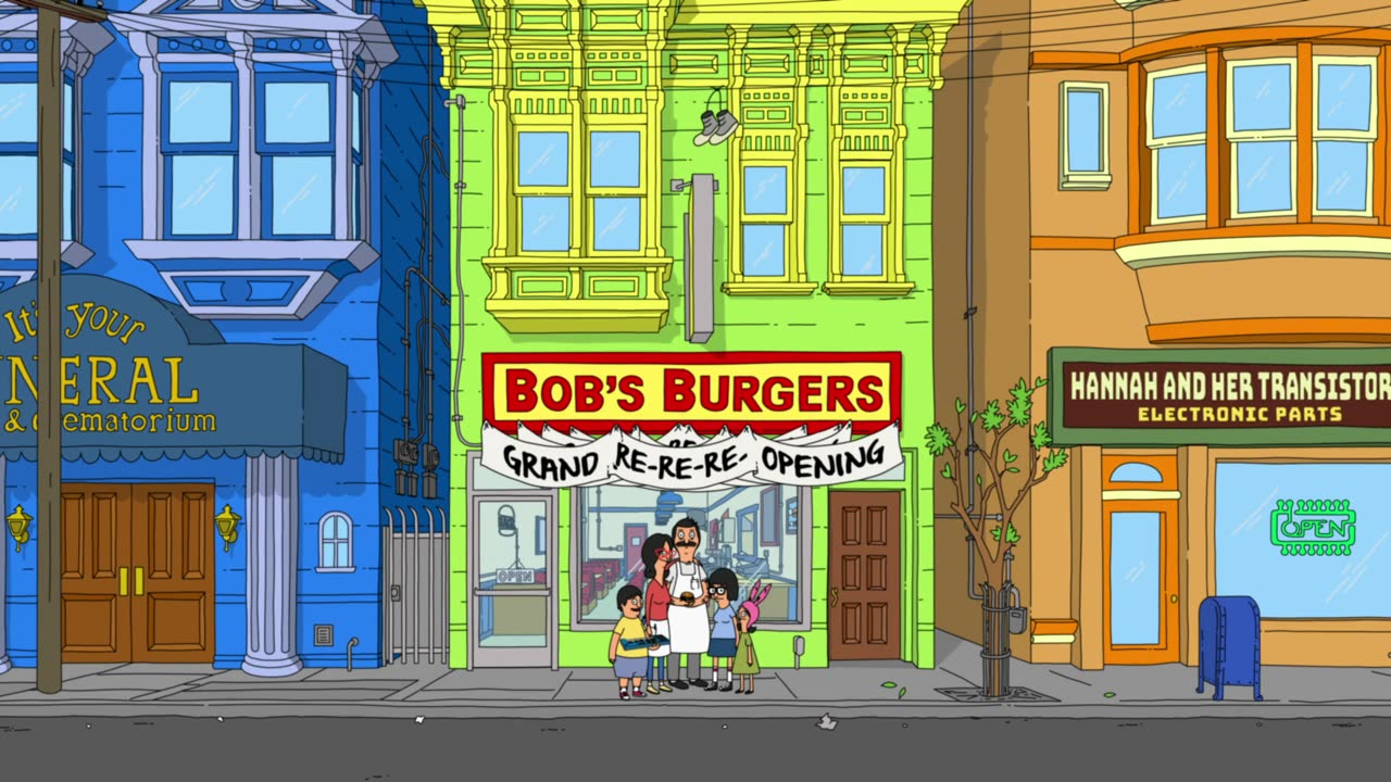 Bob's Burgers follows a third-generation restaurateur, Bob, as he runs Bob's Burgers with the help of his wife and their three kids. Bob and his quirky family have big ideas about burgers, but fall short on service and sophistication. Despite the greasy counters, lousy location and a dearth of customers, Bob and his family are determined to make Bob's Burgers "grand re-re-re-opening" a success.