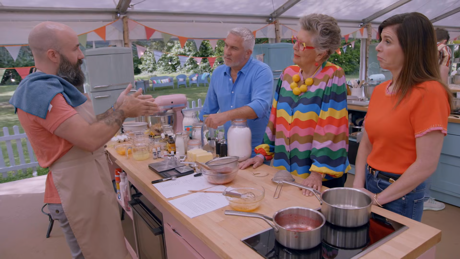 Legendary judges Prue Leith and Paul Hollywood are back with a new season of The Great American Baking Show with hosts Ellie Kemper and Zach Cherry, where nine amateur bakers from around America enter the iconic tent for unique signature challenges.