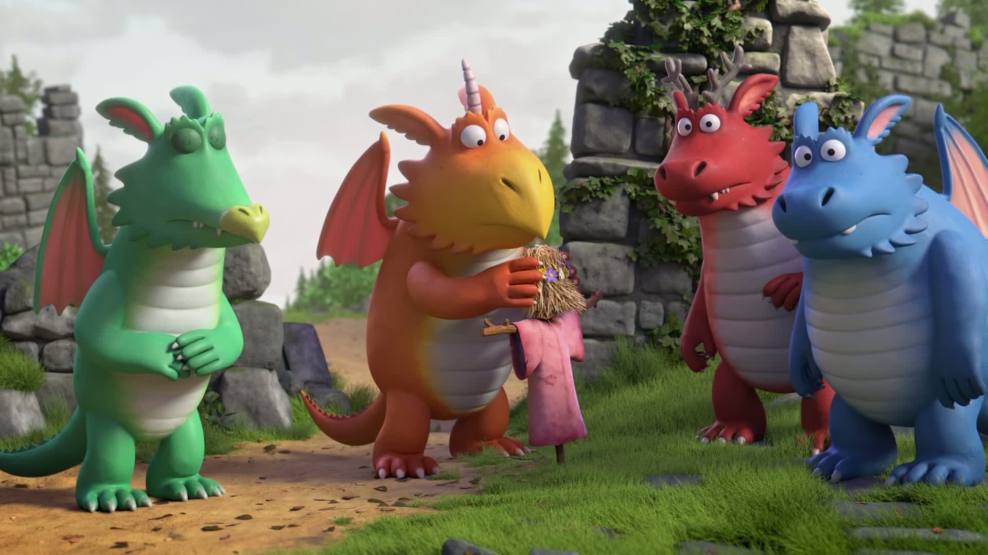 Zog is a keen young dragon who wants to learn to fly, roar, and breathe fire, so he studies at the Dragon School. He is desperate to impress his teacher and win a golden star, but he is prone to accidents and he has to be helped by a kind young girl who patches up his bumps and bruises.