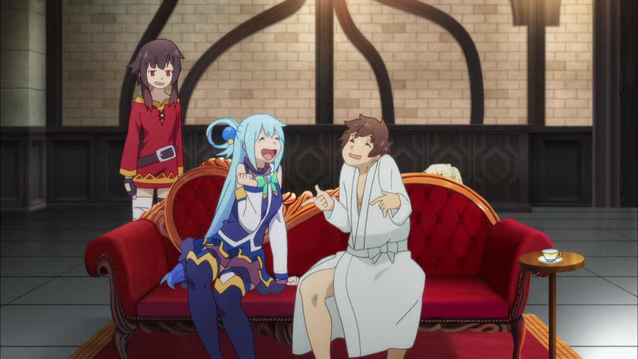 After a traffic accident, Kazuma Sato’s disappointingly brief life was supposed to be over, but he wakes up to see a beautiful girl before him. She claims to be a goddess, Aqua, and asks if he would like to go to another world and bring only one thing with him. Kazuma decides to bring the goddess herself, and they are transported to a fantasy world filled with adventure, ruled by a demon king. Now Kazuma only wants to live in peace, but Aqua wants to solve many of this world’s problems, and the demon king will only turn a blind eye for so long…