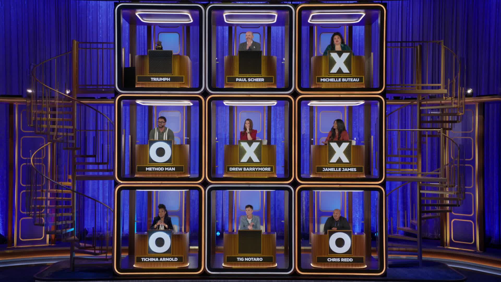 Two contestants play tic-tac-toe to win money and prizes. The "board" for the game is a vertical stack of open-faced cubes, each occupied by a celebrity seated at a desk and facing the contestants. The celebrities are asked questions and the contestants judge the legitimacy of their answers to win the game.
