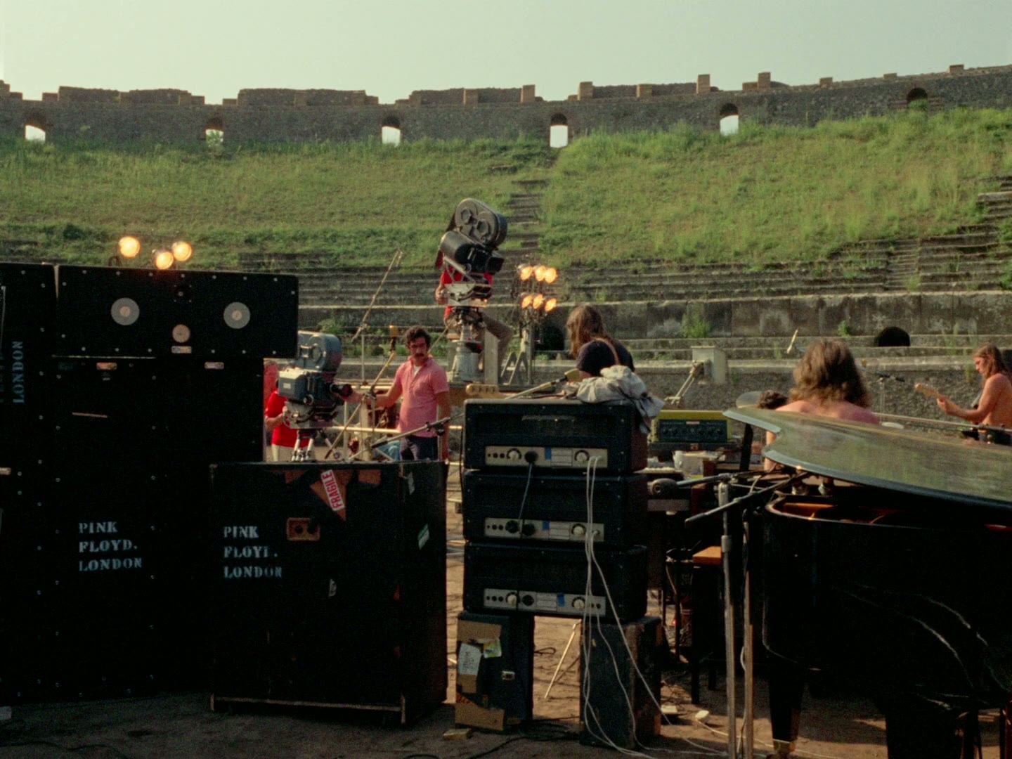 British progressive rock band Pink Floyd perform at the ancient Roman Amphitheater in the ruins of Pompeii, Italy in 1971. Although the band perform a typical live set from the era, there is no audience beyond the basic film crew.