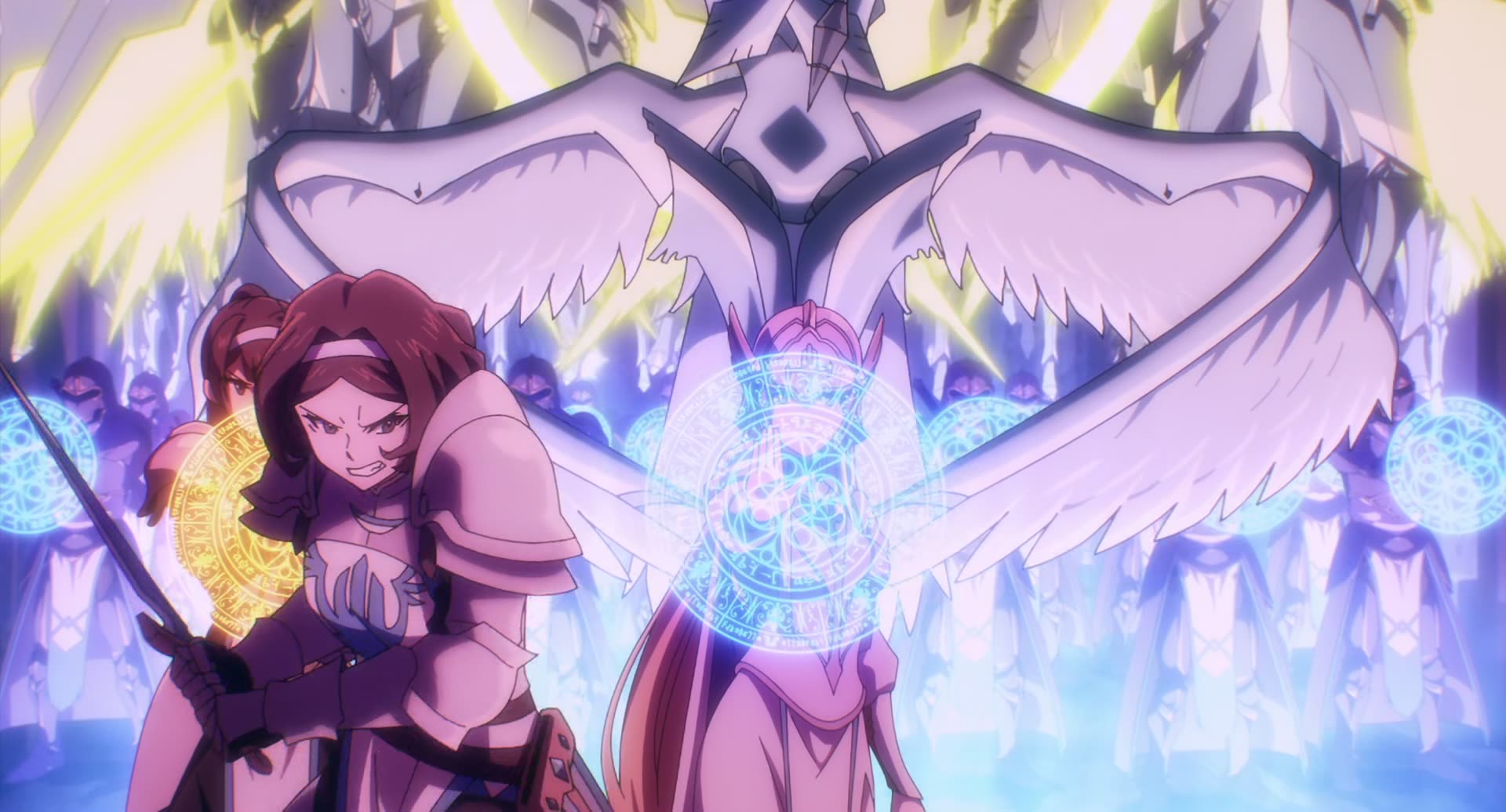 After twelve years of playing his favorite MMORPG game, Momonga logs in for the last time only to find himself transported into its world playing it indefinitely. Throughout his adventures, his avatar ascends to the title of Sorcerer King Ains Ooal Gown. Once prosperous but now on the brink of ruin, The Sacred Kingdom enjoyed years of peace after construction of an enormous wall protecting them from neighboring invasions. But, one day this comes to an end when the Demon Emperor Jaldabaoth arrives with an army of villainous demi-humans. Fearing invasion of their own lands, the neighboring territory of the Slane Theocracy is forced to beg their enemies at the Sorcerer Kingdom for help. Heeding the call, Momonga, now known as the Sorcerer King Ains Ooal Gown, rallies the Sorcerer Kingdom and its undead army to join the fight alongside the Sacred Kingdom and the Slane Theocracy in hopes to defeat the Demon Emperor.