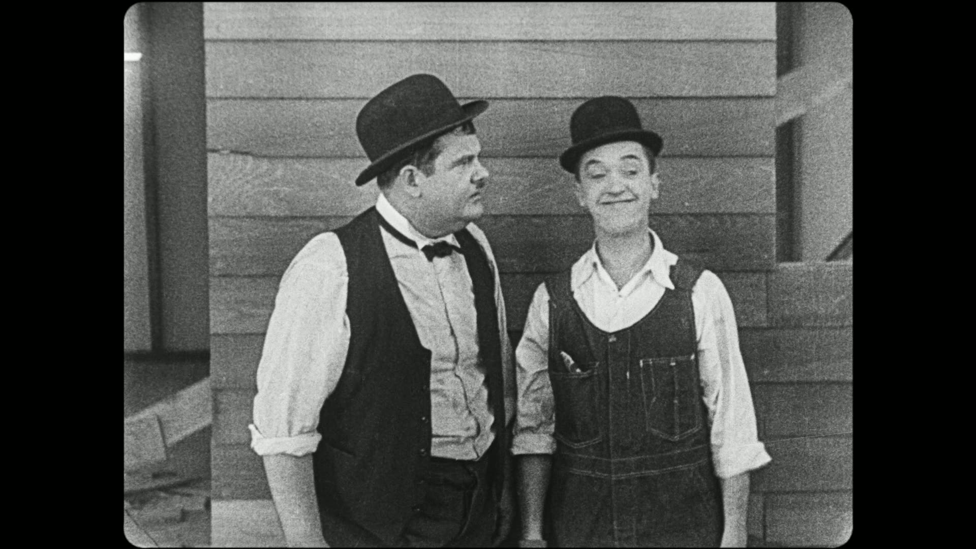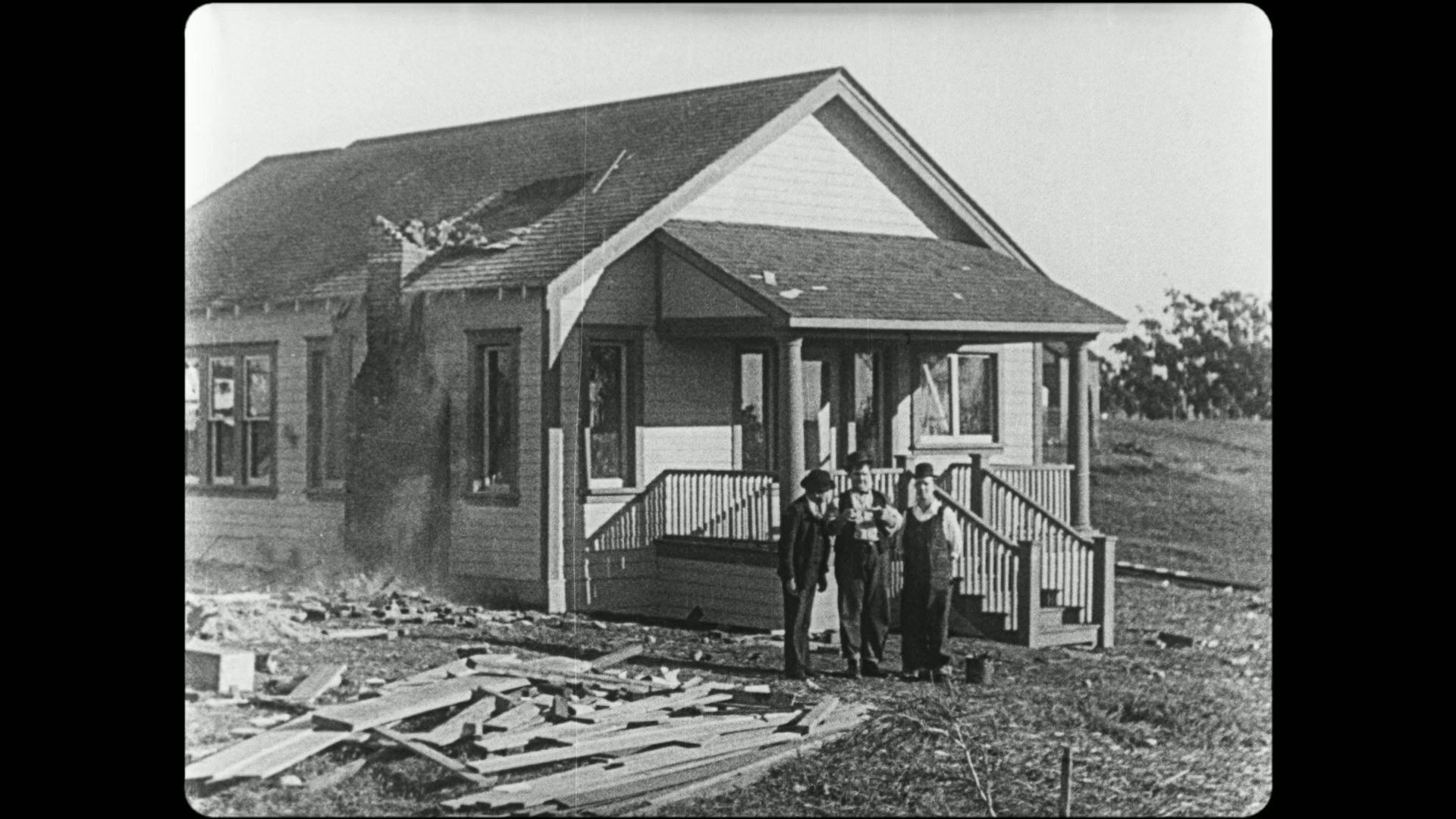 Stan and Ollie are hired to build a house in just one day. When they are done, a bird lands on the house and it collapses. Naturally, the owner wants his money back.