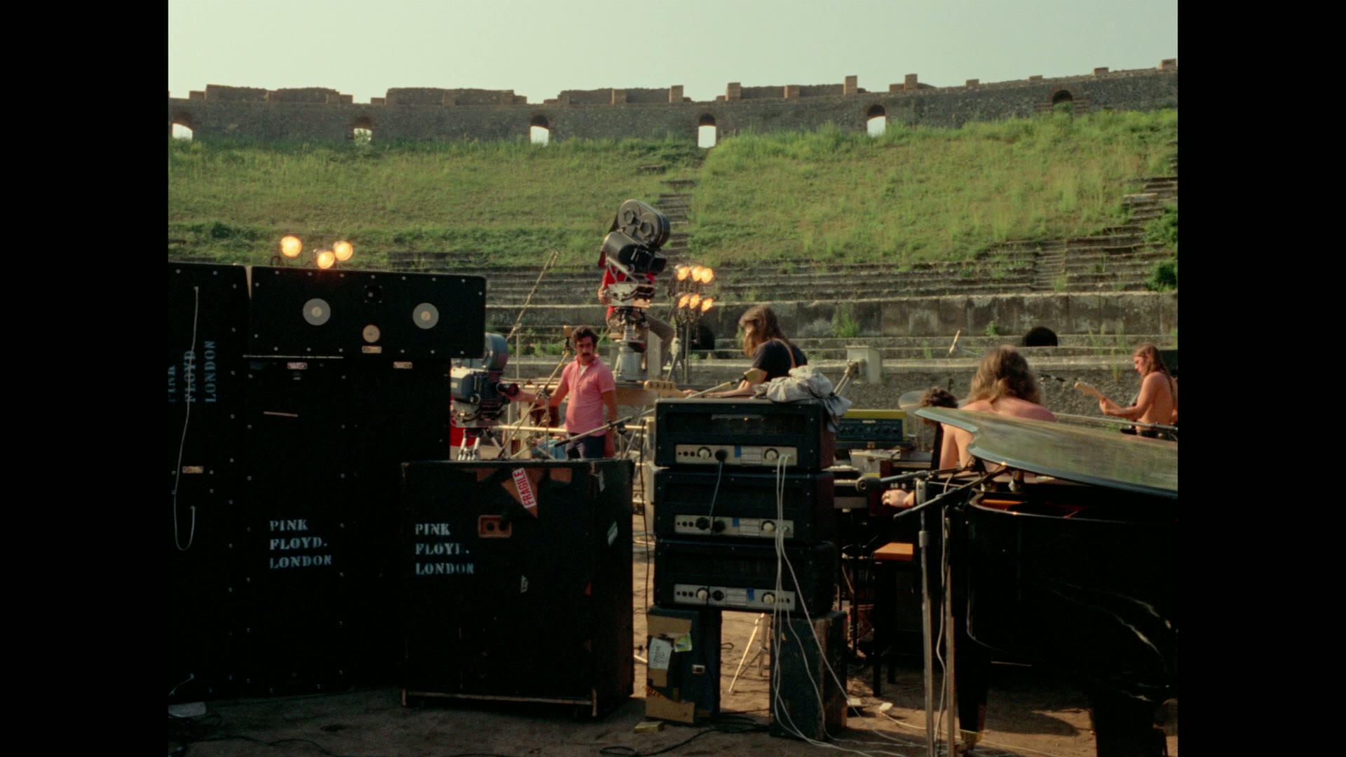 British progressive rock band Pink Floyd perform at the ancient Roman Amphitheater in the ruins of Pompeii, Italy in 1971. Although the band perform a typical live set from the era, there is no audience beyond the basic film crew.