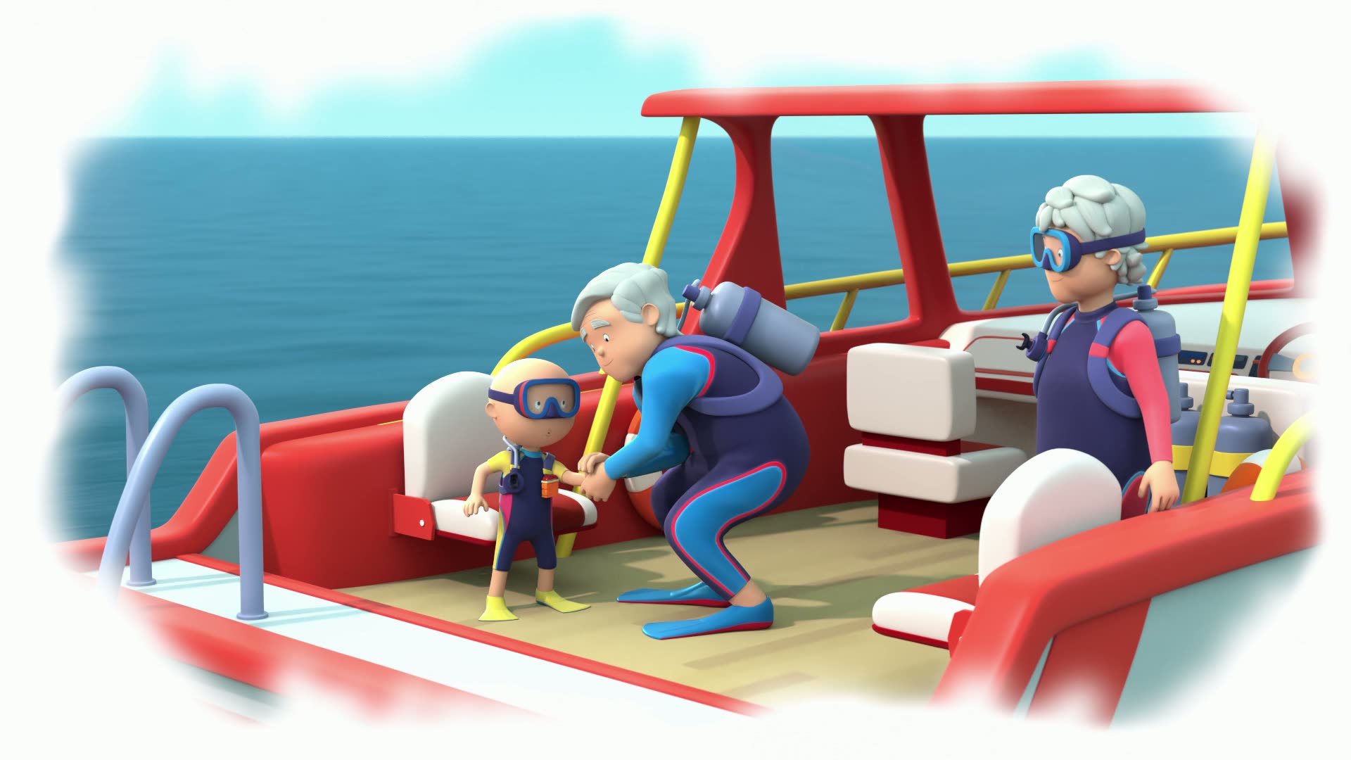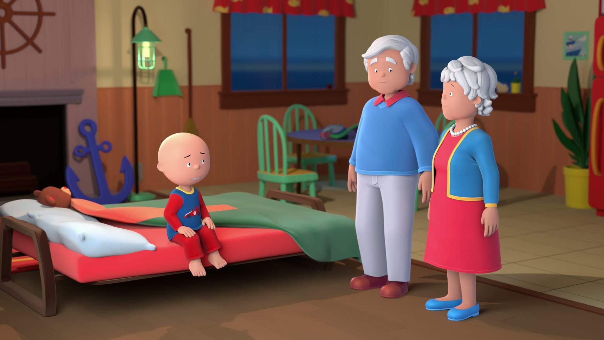 During a sleepover at his grandparents' seaside cottage, Caillou is excited to try swimming in the ocean but spends his time focused on the things they do differently than his Mommy and Daddy.